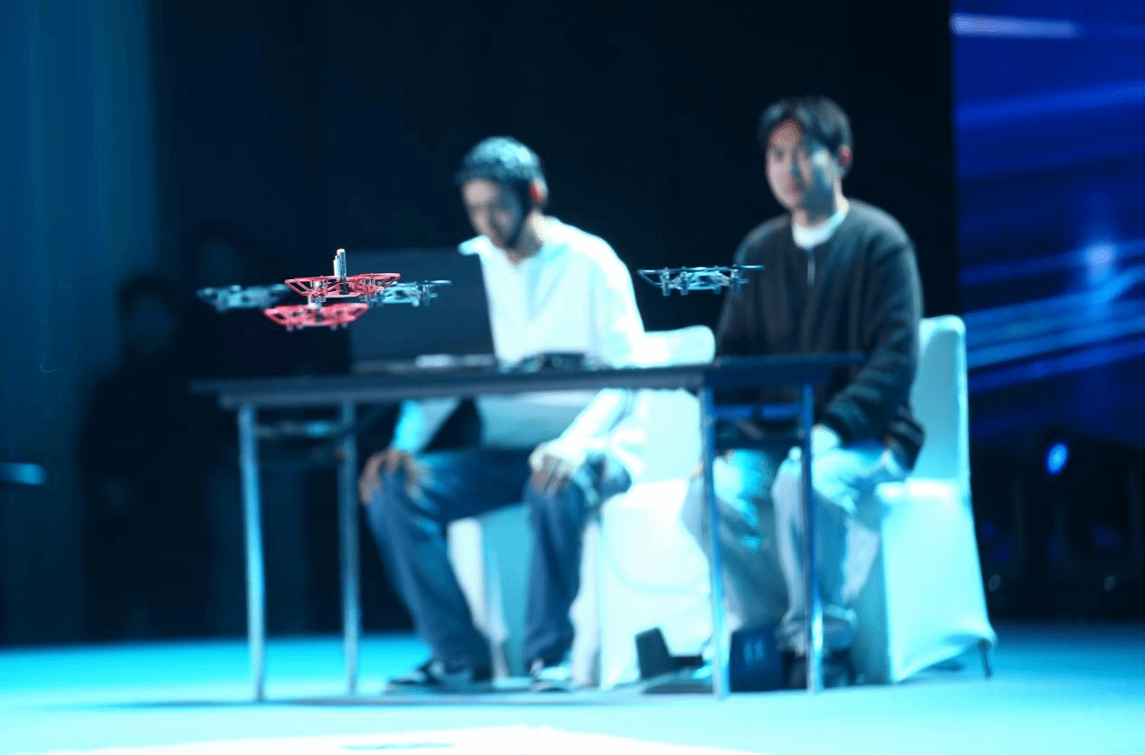 活动现场,随着AI机器人指挥棒划破夜空,一场沉浸式的科技盛宴拉开序幕。在科技成果展示环节,谢松云教授首先向与会嘉宾介绍了“脑控无人机”背后的科学奥秘,随后团队进行了现场演示,操控人员佩戴一顶脑电帽,目光注视屏幕上对应的闪烁块,系统即可精准捕捉并解析脑电信号,将其转化为飞行指令。在众人的见证下,无人机编队根据操控者的“心意”,在空中轻盈地变换队形,实现了从“想法”到“行动”的跨时空连接。