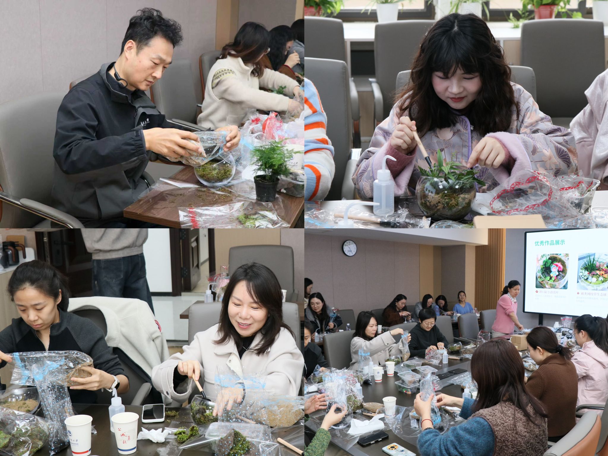 讲座结束后,活动现场变身充满绿意的手作工坊,大家开始了微景观 DIY手作,透明玻璃容器、鲜活苔藓、各色水晶原石、迷你绿植等材料整齐陈列,在专业人员的指导下,每位老师亲手打造了专属的迷你生态小世界,在指尖绿意中放松心情,治愈心灵。