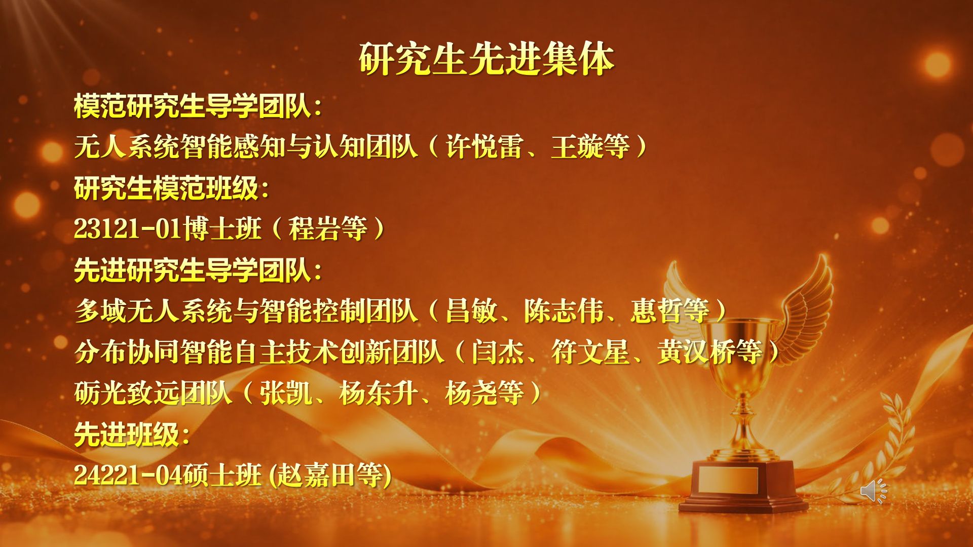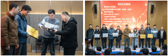 毛昭勇和徐晓峰为获得研究生先进集体的无人系统智能感知与认知团队等4个团队、2个班级颁奖。这些集体凝心聚力、团结协作,展现了研究院良好的导学关系和班风学风。