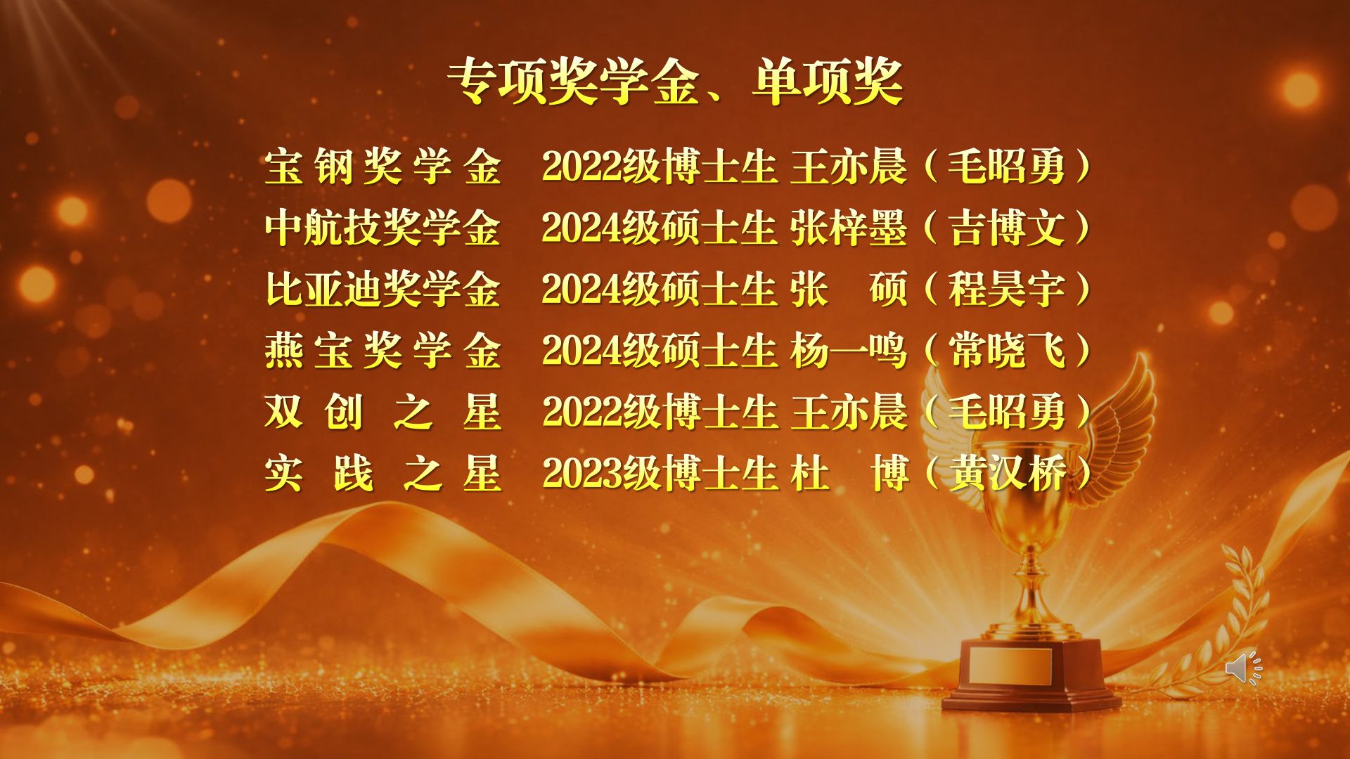 研究院教学秘书马思静为获得宝钢奖学金、中航技奖学金、比亚迪奖学金、燕宝奖学金等专项奖学金,以及获得“双创之星”、“实践之星”等单项荣誉称号的王亦晨等6位同学颁奖。这些荣誉不仅代表了社会各界对西工大学子的认可,更彰显了同学们全面发展的综合素质。