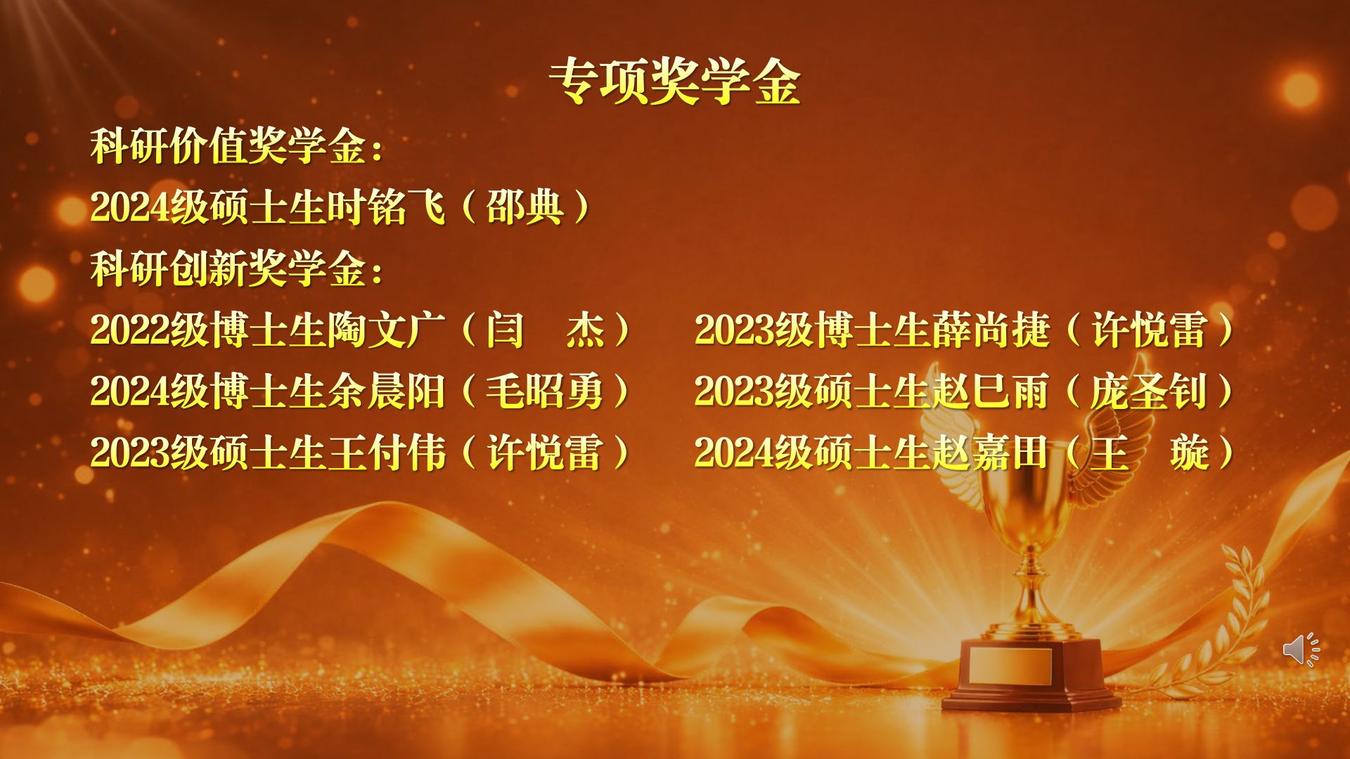 研究院员工第三党支部书记杨韬为获得科研价值奖学金、科研创新奖学金的时铭飞等7位同学颁奖。他们在学术前沿勇于探索,以高质量的科研成果诠释了研途的奋斗底色。
